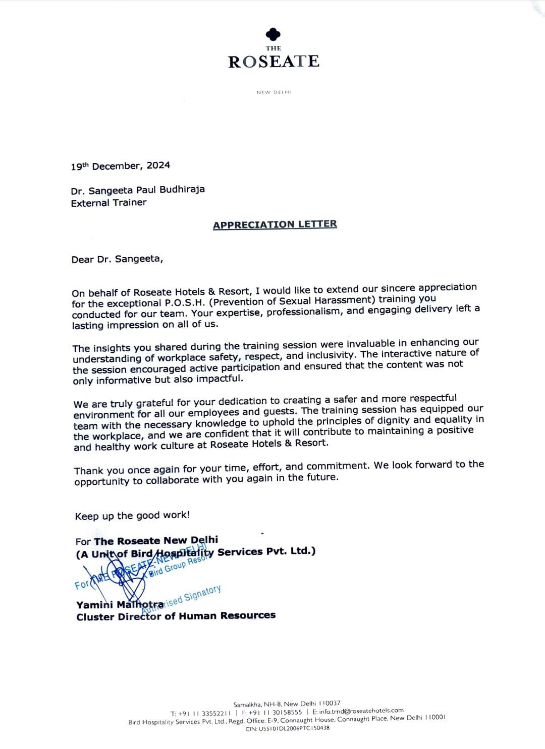 Parivartan – The Change successfully conducted a structured and insightful POSH (Prevention of Sexual Harassment) training at Roseate Hotel, aimed at reinforcing a culture of dignity, respect, and safety in the workplace.